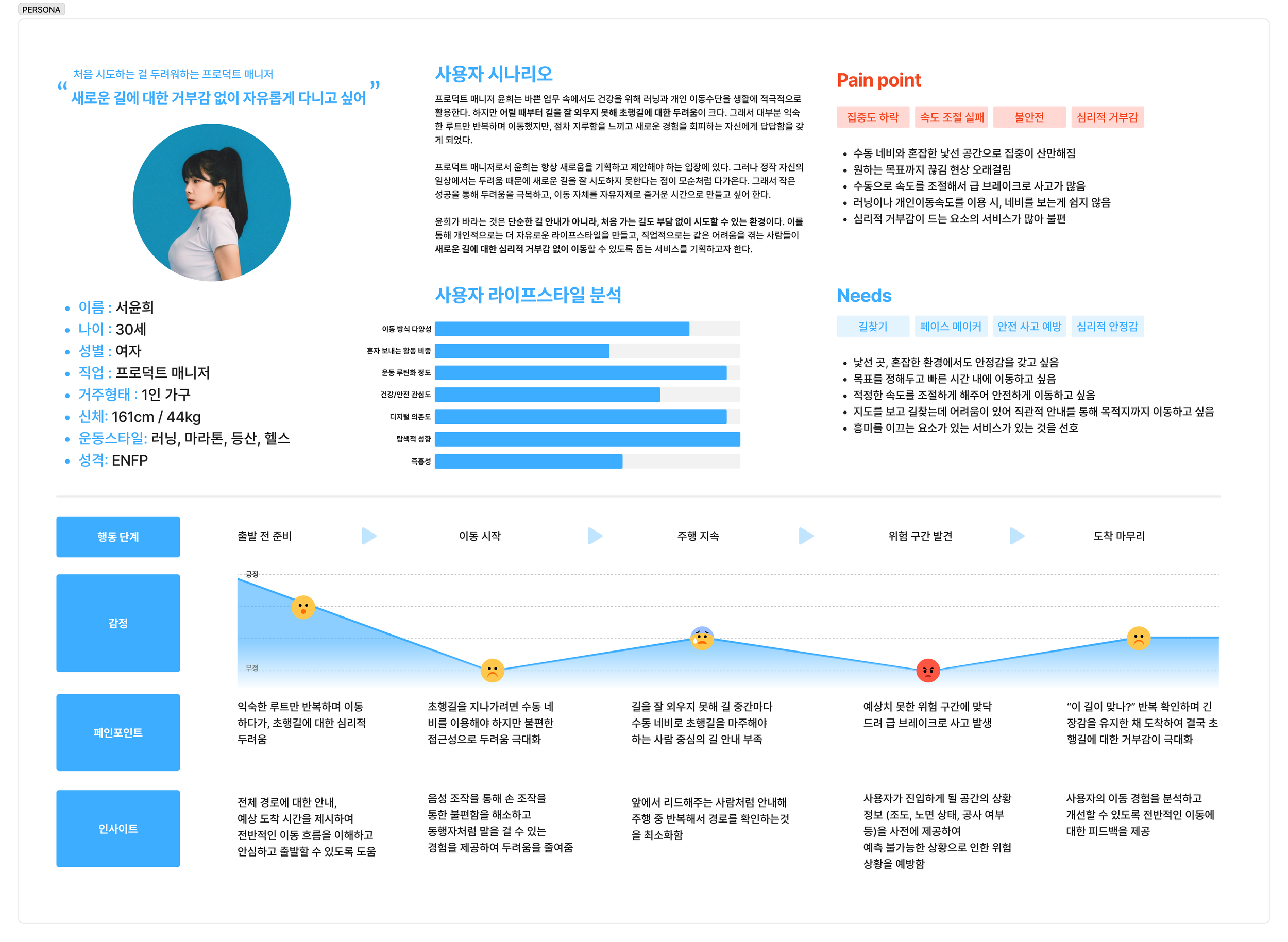 [2학기] 4주차-아이데이션 Oct 1 Written By 세연 강 HMW [시간대] 어떻게 하면 주야간 조도에 맞게 안내를 제공할 수 있을까?[사람 중심] 어떻게 하면 이동 중에도 사람이 쉽게 길을 이해하고 따라갈 수 있도록 도와줄 수 있을까?[안전] 어떻게 하면 사용자가 끊김없이 안전하게 목적지에 도달할 수 있도록 설계할 수 있을까?[속도] 어떻게 하면 개인별 속도 페이스를 조절할 수 있도록 안내할 수 있을까? PERSONA STORYBOARD 세연 강