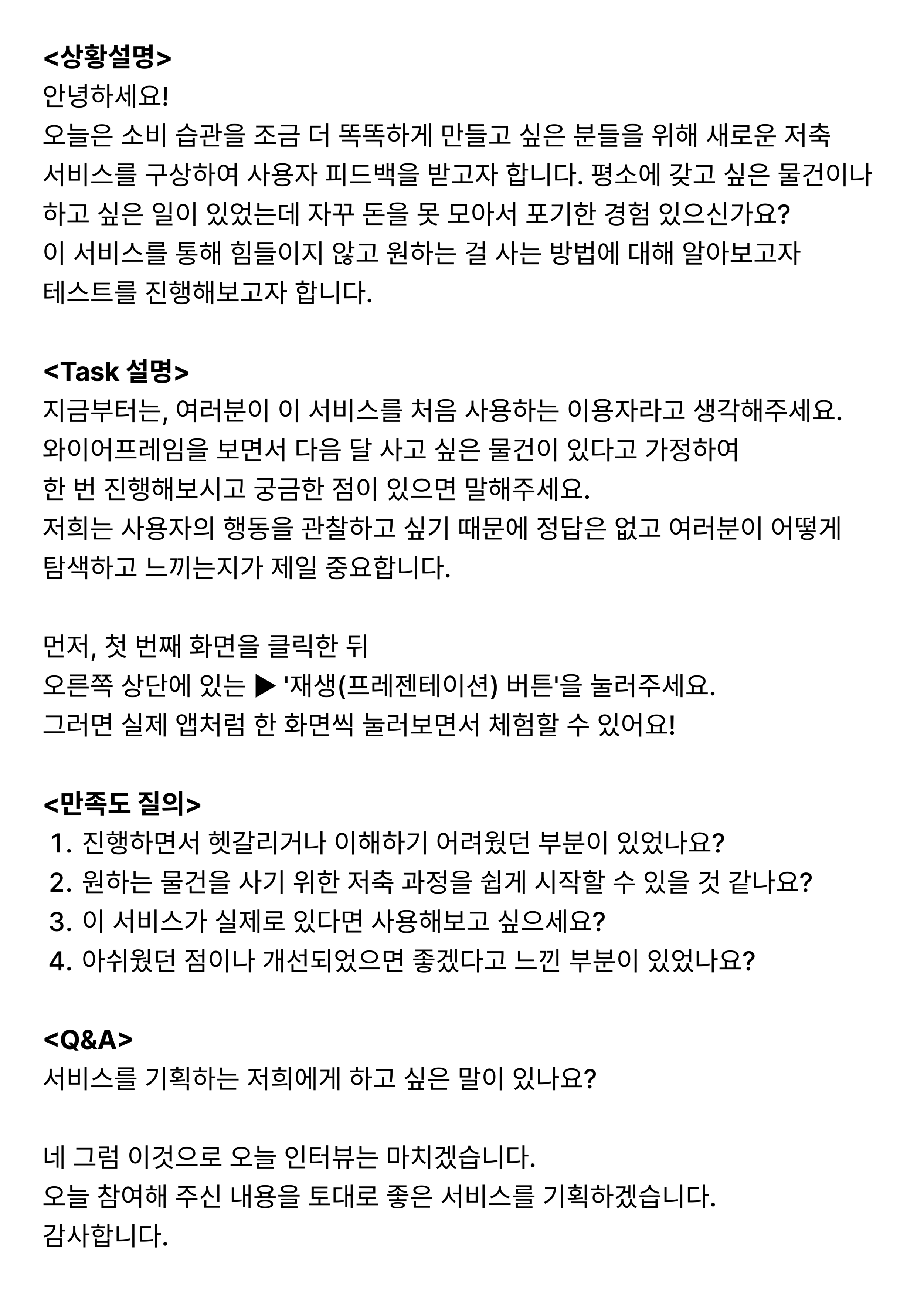 초기 프로토타입에 대한 사용자 반응을 확인하기 위해 로우파이 와이어프레임을 기반으로 인터뷰를 실시하였으며 이에 필요한 인터뷰지도 함께 작성하여 피드백을 수집하였습니다.
